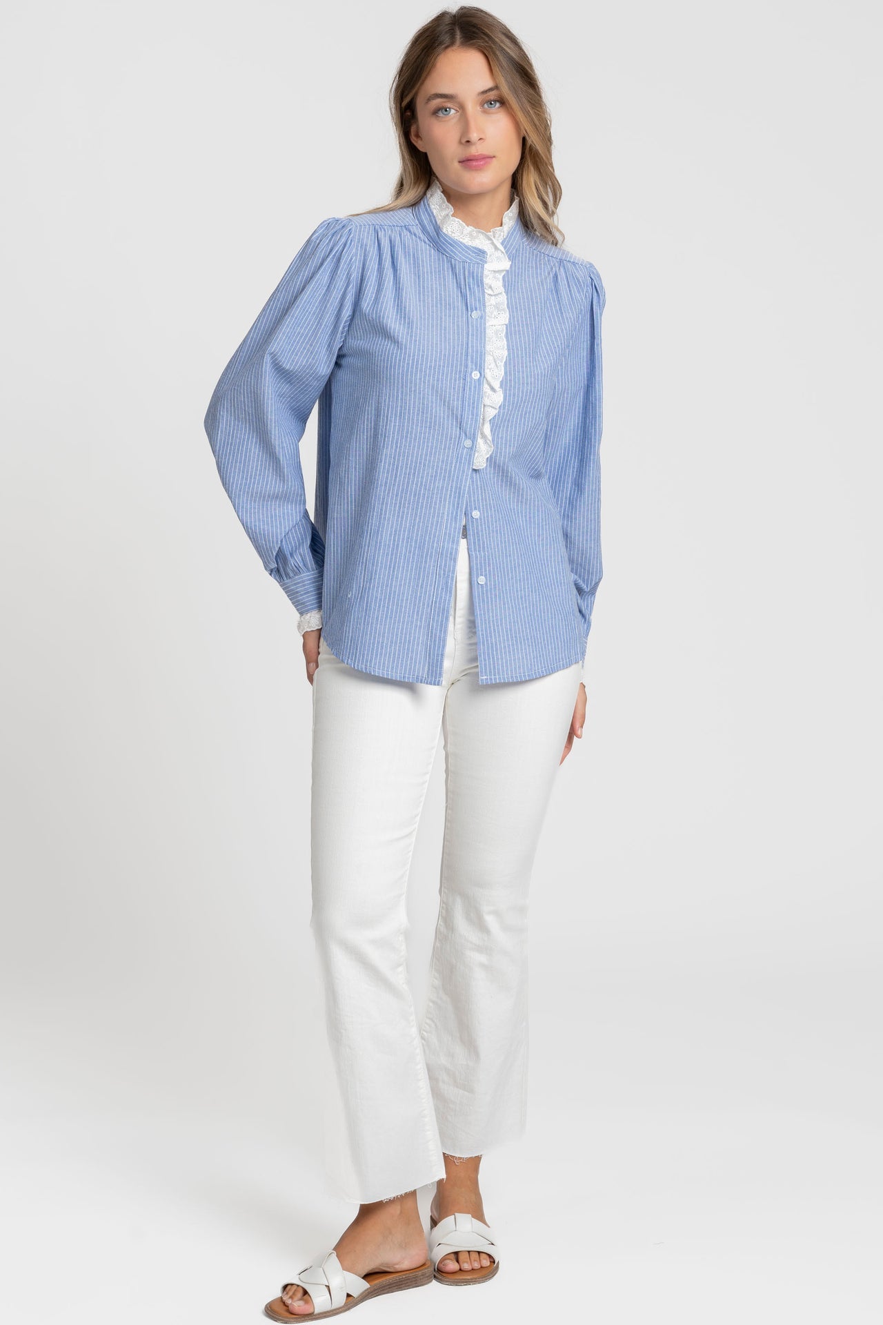 Este diseño combina lo clásico y lo moderno, permitiendo crear conjuntos pulidos sin esfuerzo. El encaje en cuello y puños agrega elegancia sutil, mientras las rayas y la silueta relajada facilitan combinarla con pantalones o faldas para diferentes ocasiones. Es una opción versátil para ampliar tu guardarropa con una prenda que eleva cualquier look.