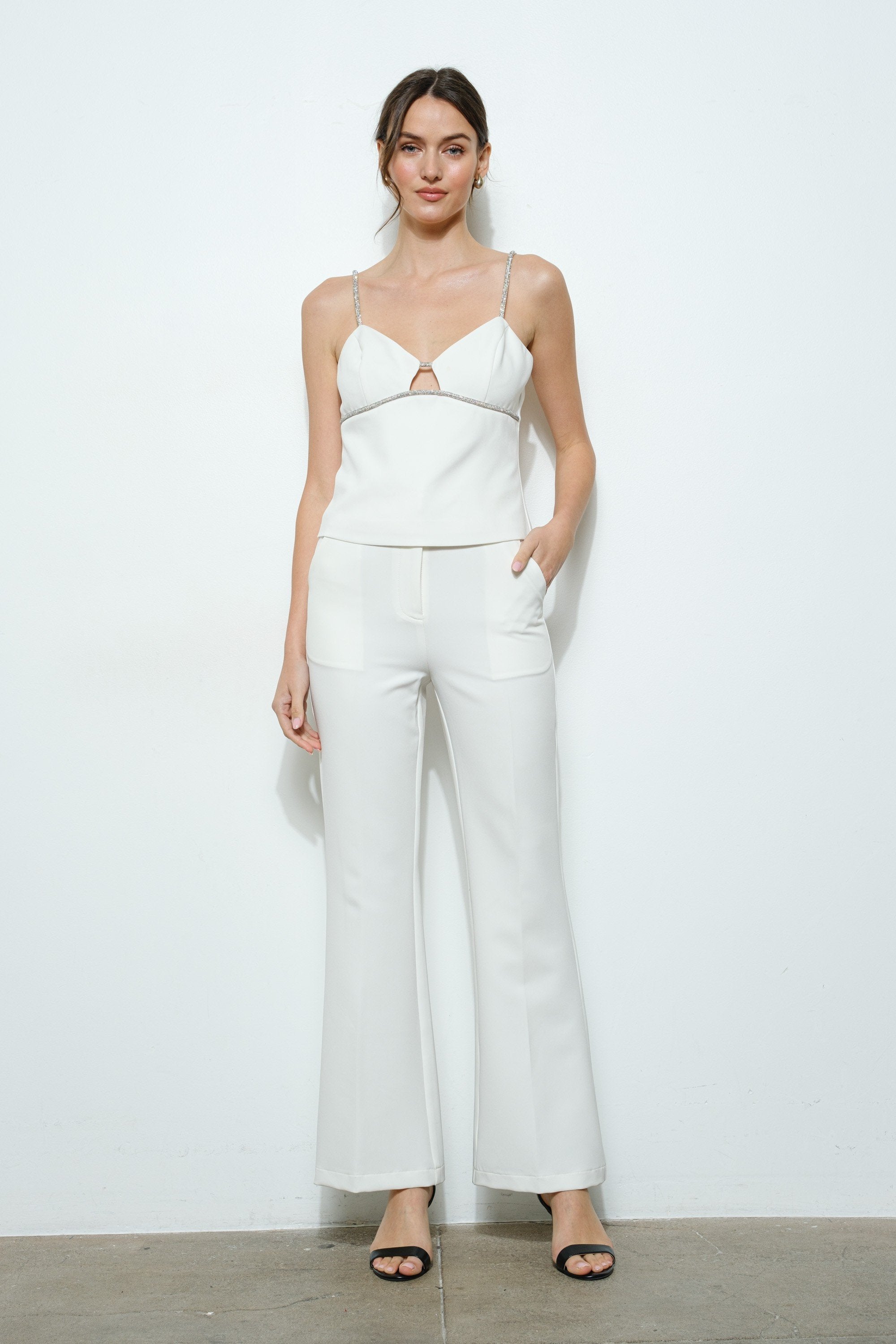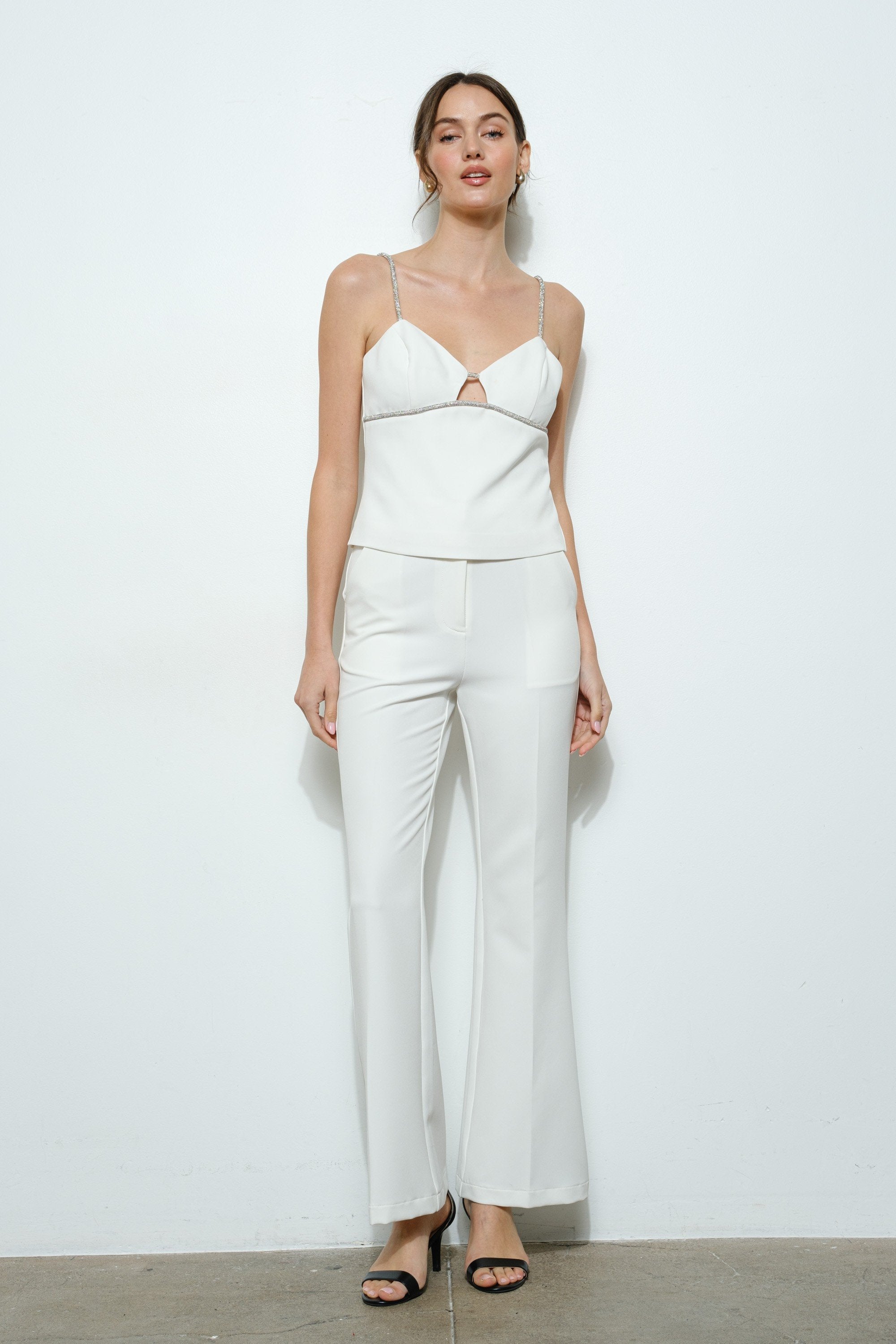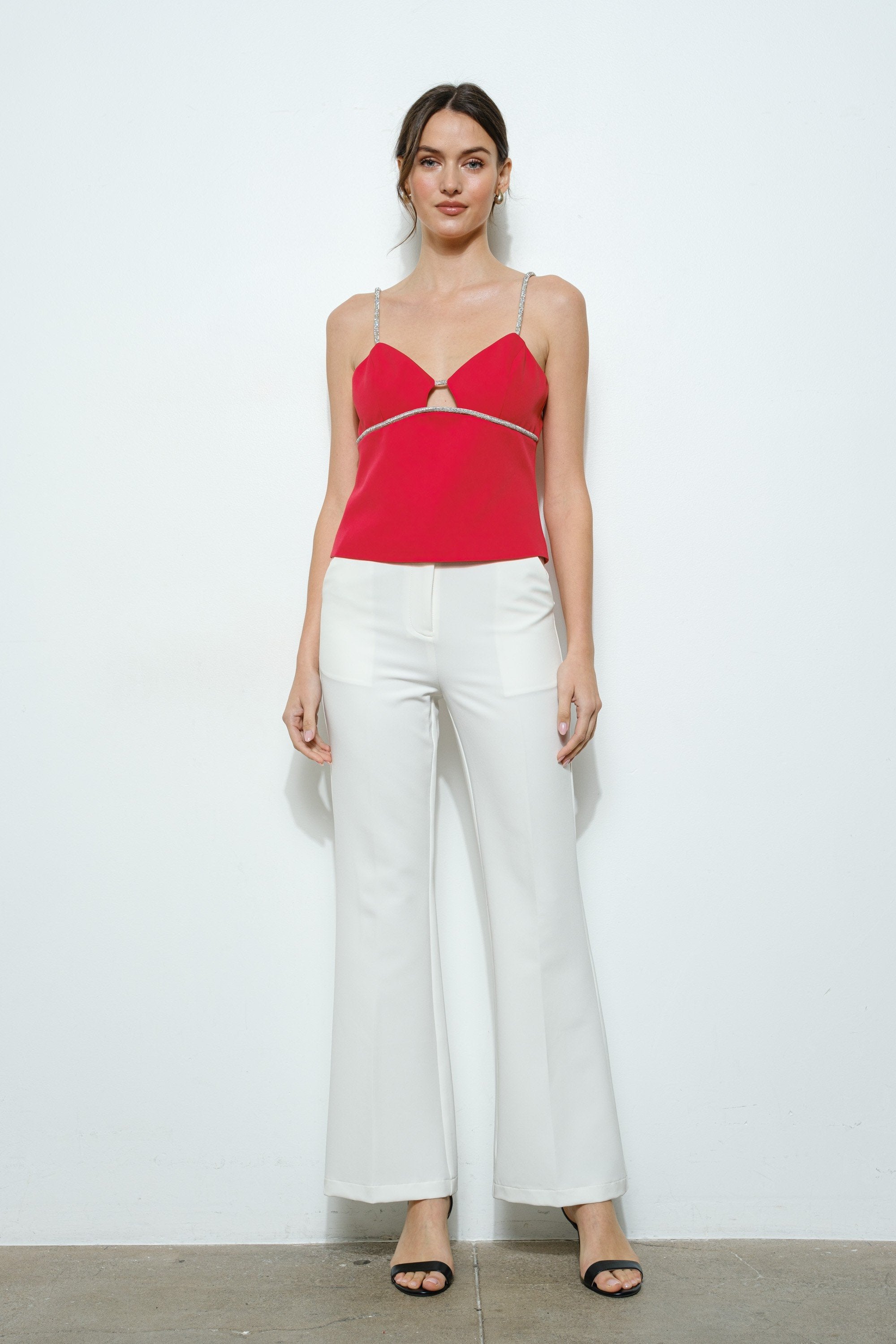 - Tirantes finos adornados con brillo plateado para un toque glamuroso.