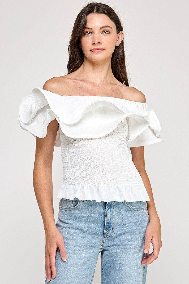 Descubre una blusa blanca con diseño moderno para damas: off-shoulder, volumen en las mangas y un cuerpo con textura suave que aporta un toque femenino y contemporáneo a cualquier look.