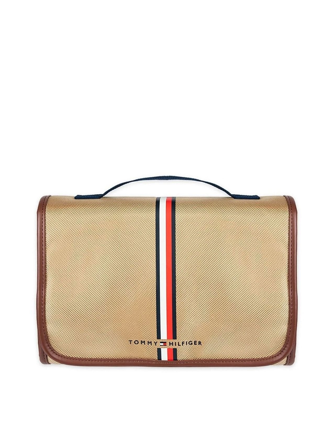 Con un acabado dorado texturizado y con ribetes en cuero marrón, destaca por su look premium y por su detalle icónico: la banda vertical en los colores rojo, blanco y azul de Tommy Hilfiger que recorre el frente.