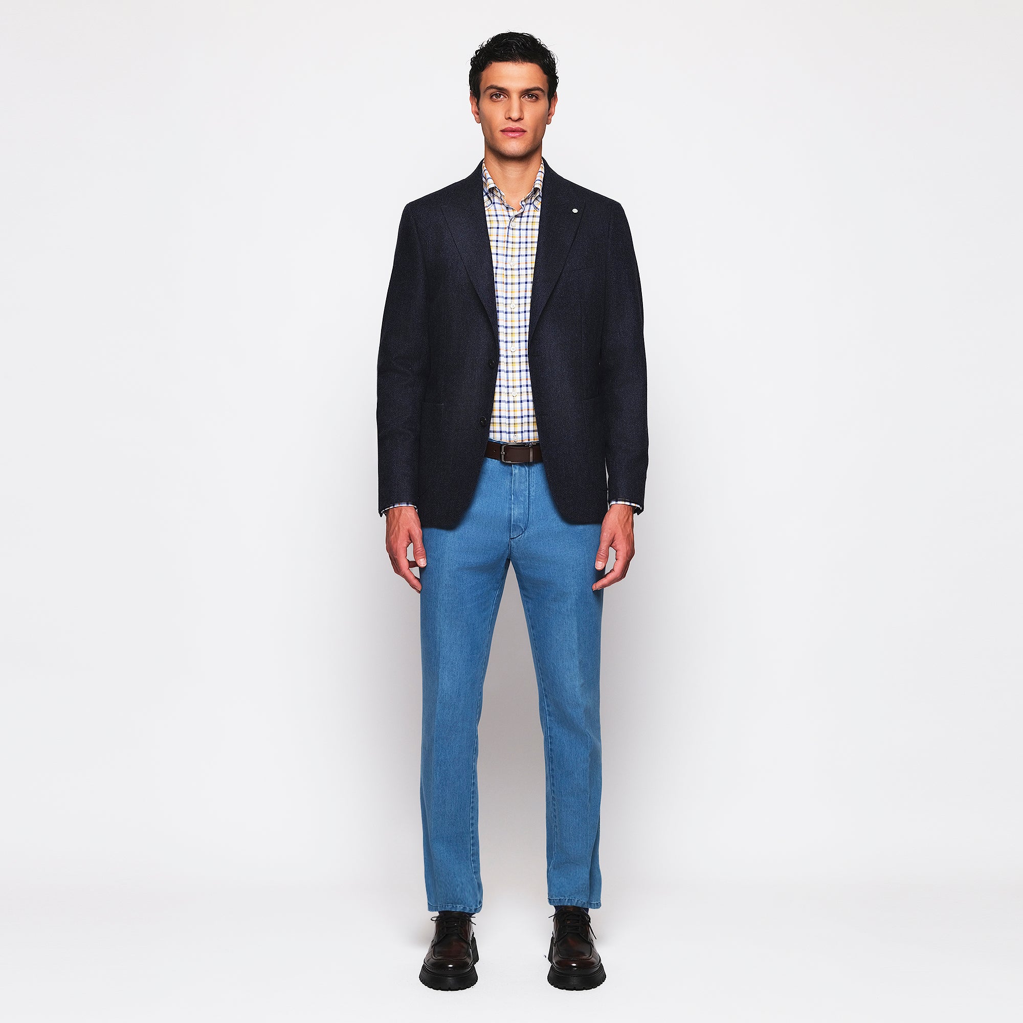 - Diseño: estampado de cuadros en combinación de azul, amarillo y blanco.