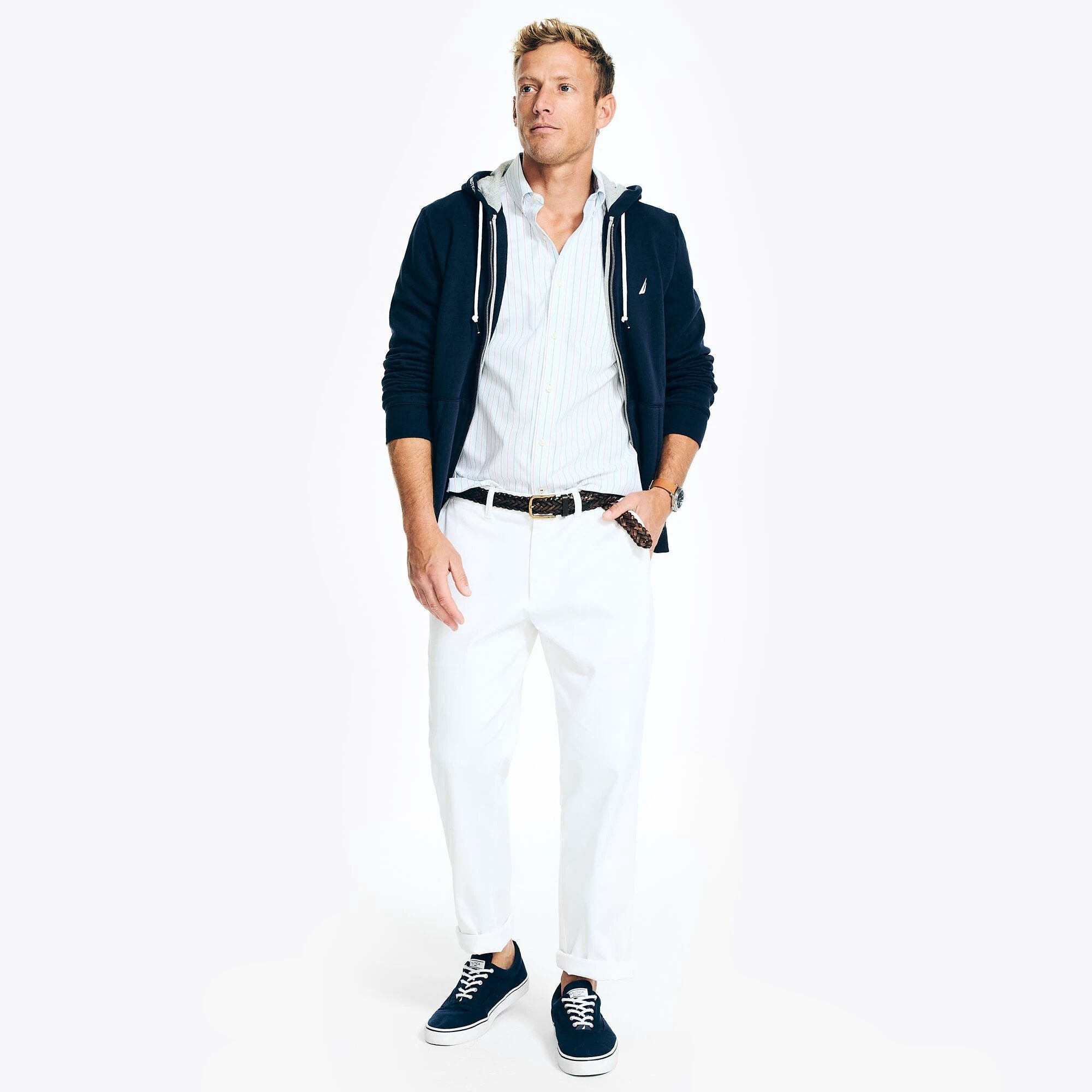 La camisa Nautica de mangas cortas con rayas es la opción fresca y versátil para caballeros que buscan un estilo casual sin esfuerzo en días cálidos. Su diseño inspirado en el estilo náutico combina facilidad de uso con un look limpio y moderno.