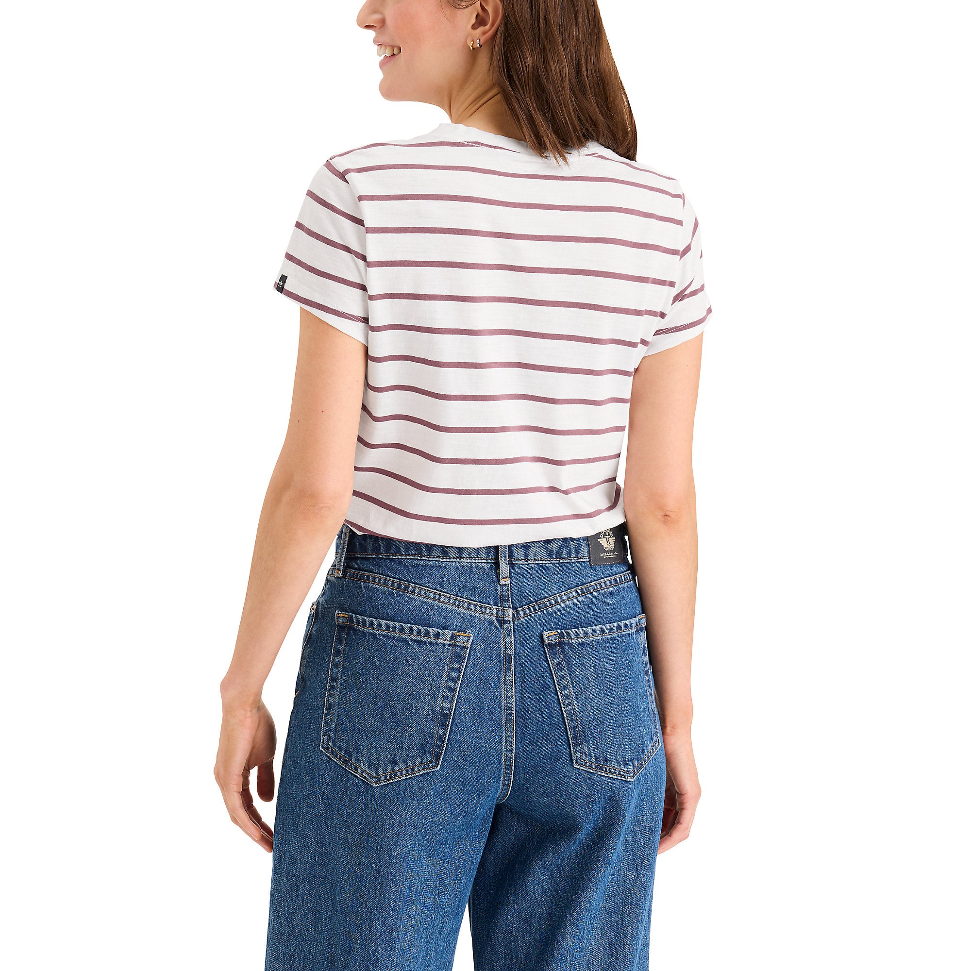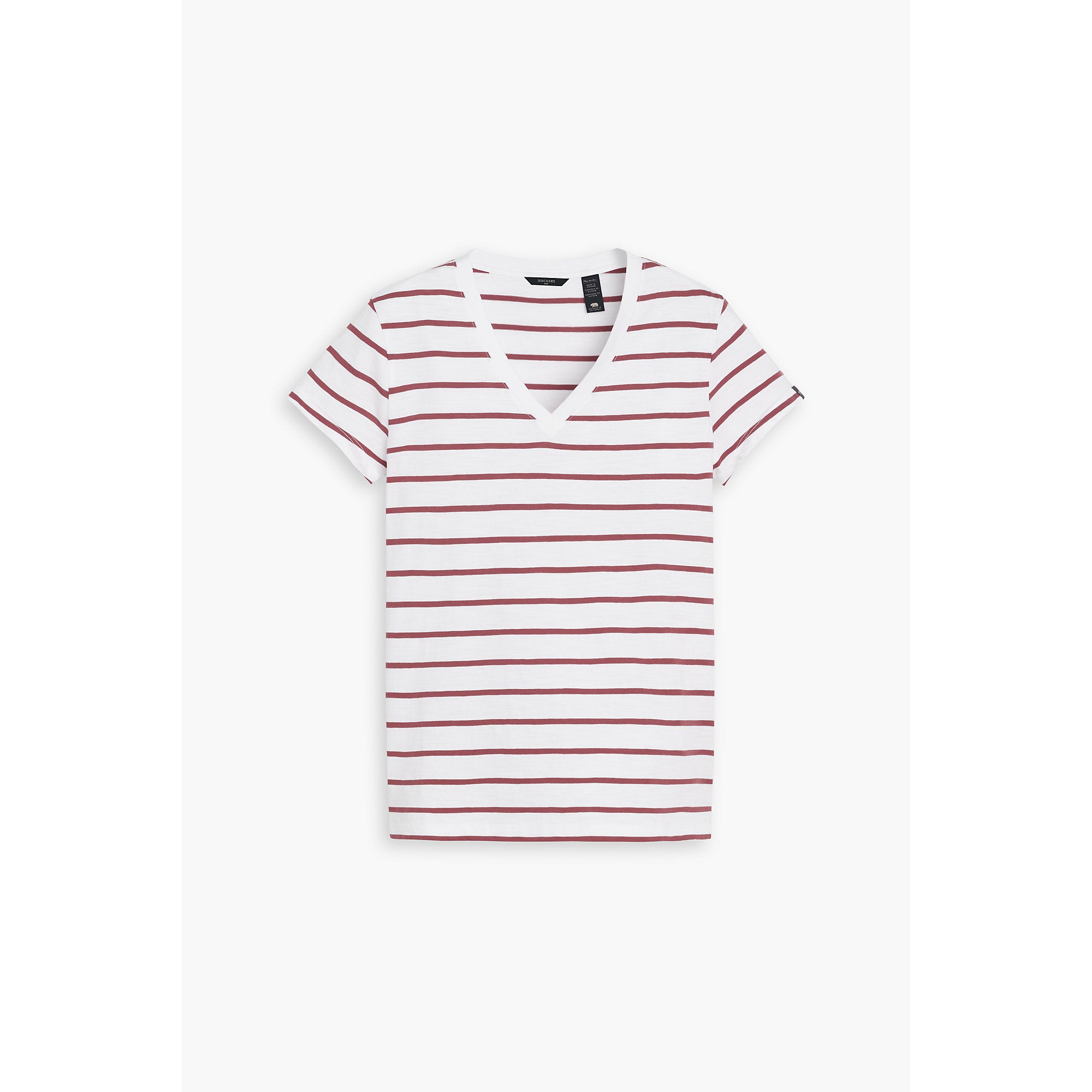 Esta camiseta Dockers de mangas cortas con rayas y cuello en V para damas es una prenda cómoda y con estilo, ideal para un look casual en Santo Domingo.