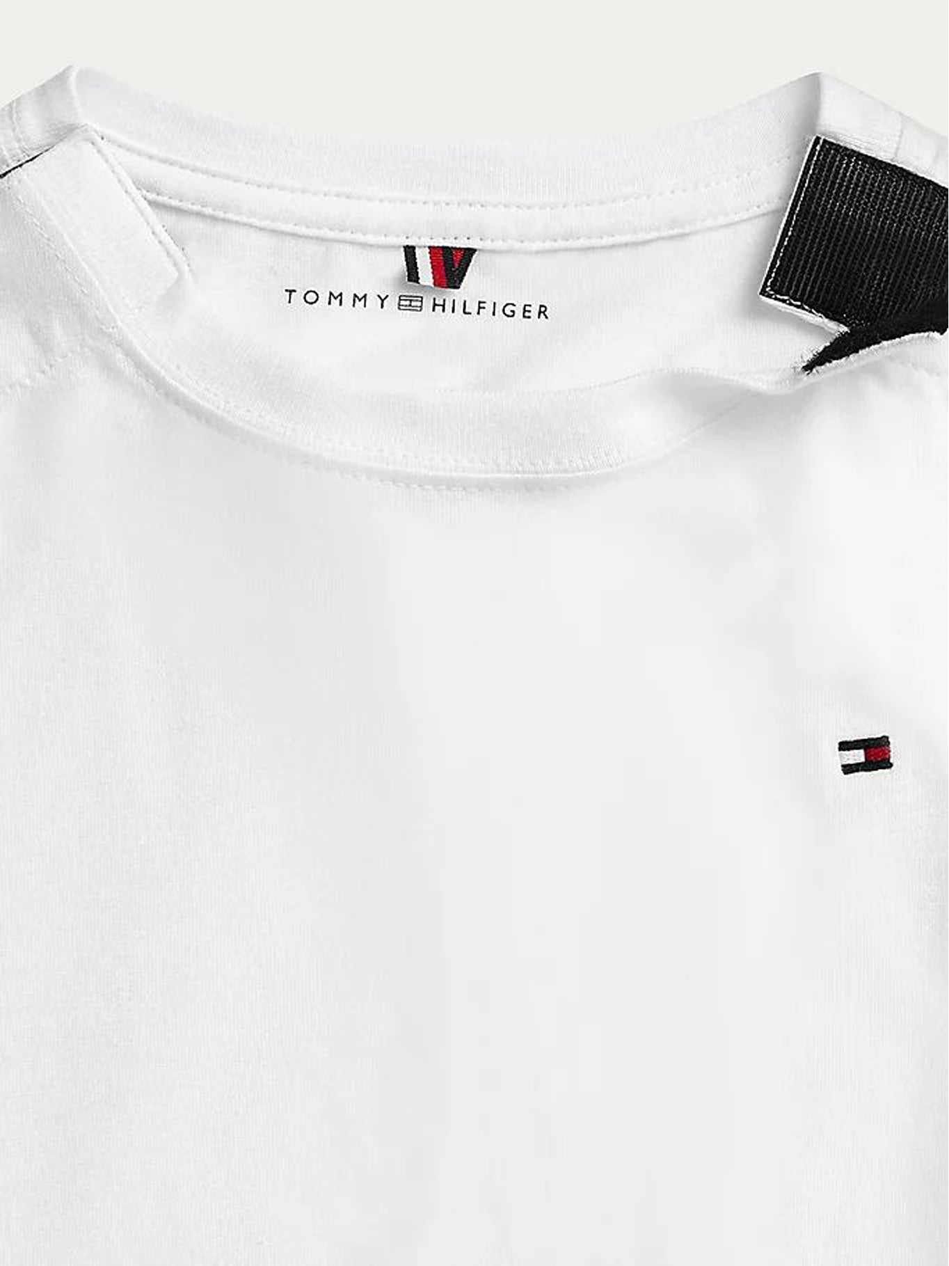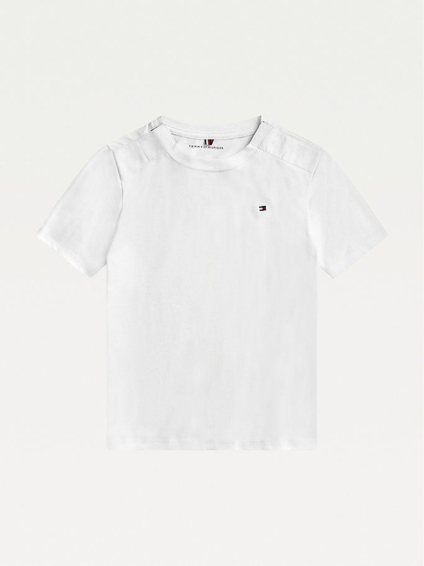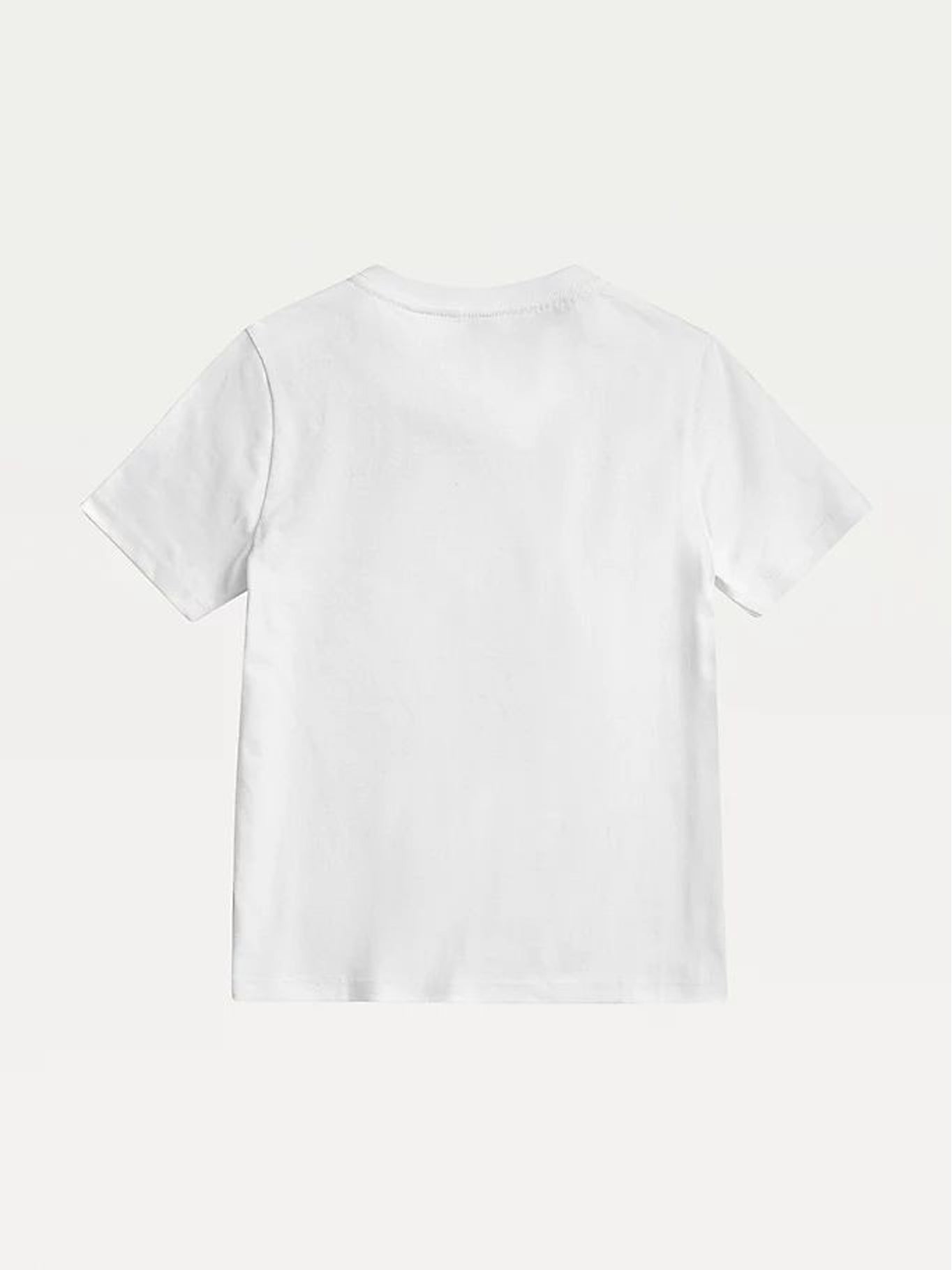 Una camiseta blanca de mangas cortas de Tommy Hilfiger para niños, diseñada para combinar estilo clásico con comodidad diaria. Su diseño liso y el sutil logotipo de la marca la hacen una base versátil para cualquier outfit infantil.