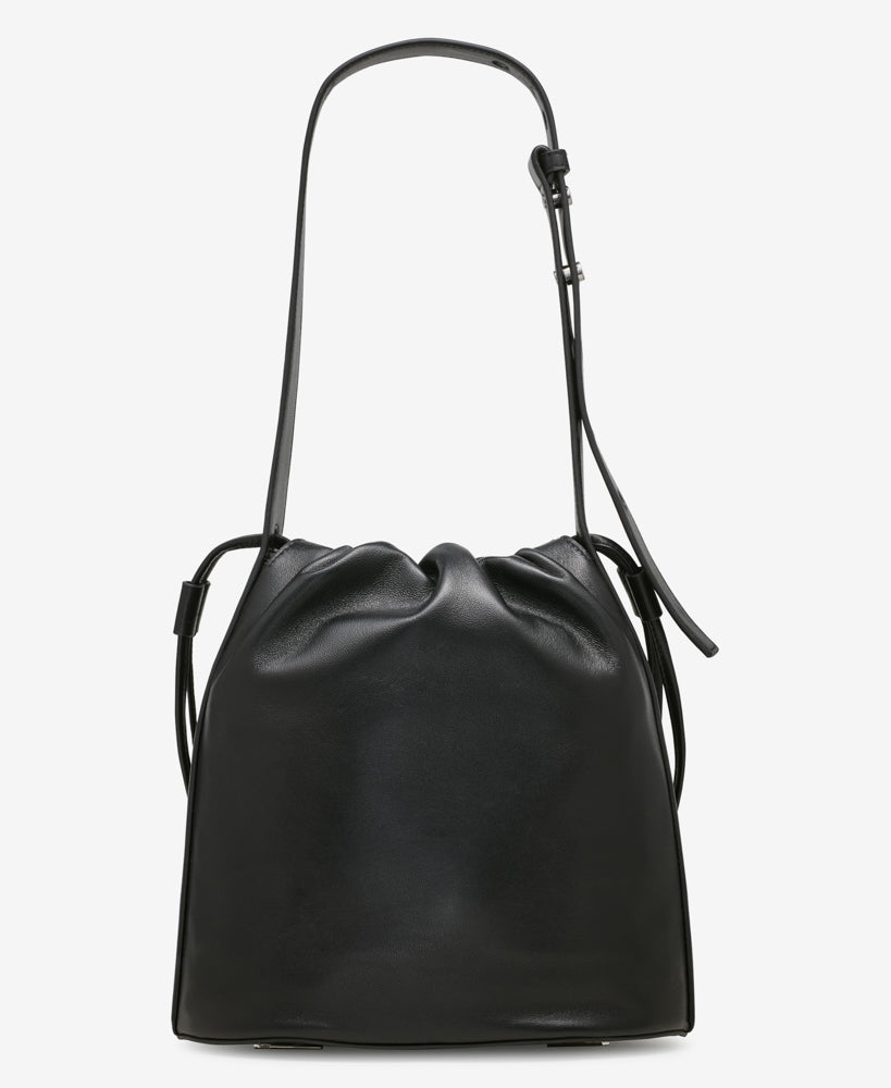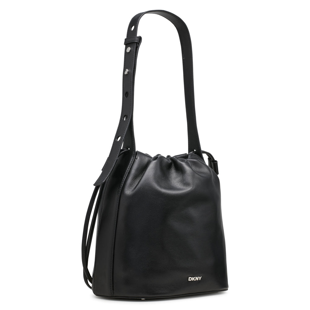 - Diseño: bolso tipo cubo con silueta minimalista y el logotipo DKNY en la parte frontal en metal plateado.
