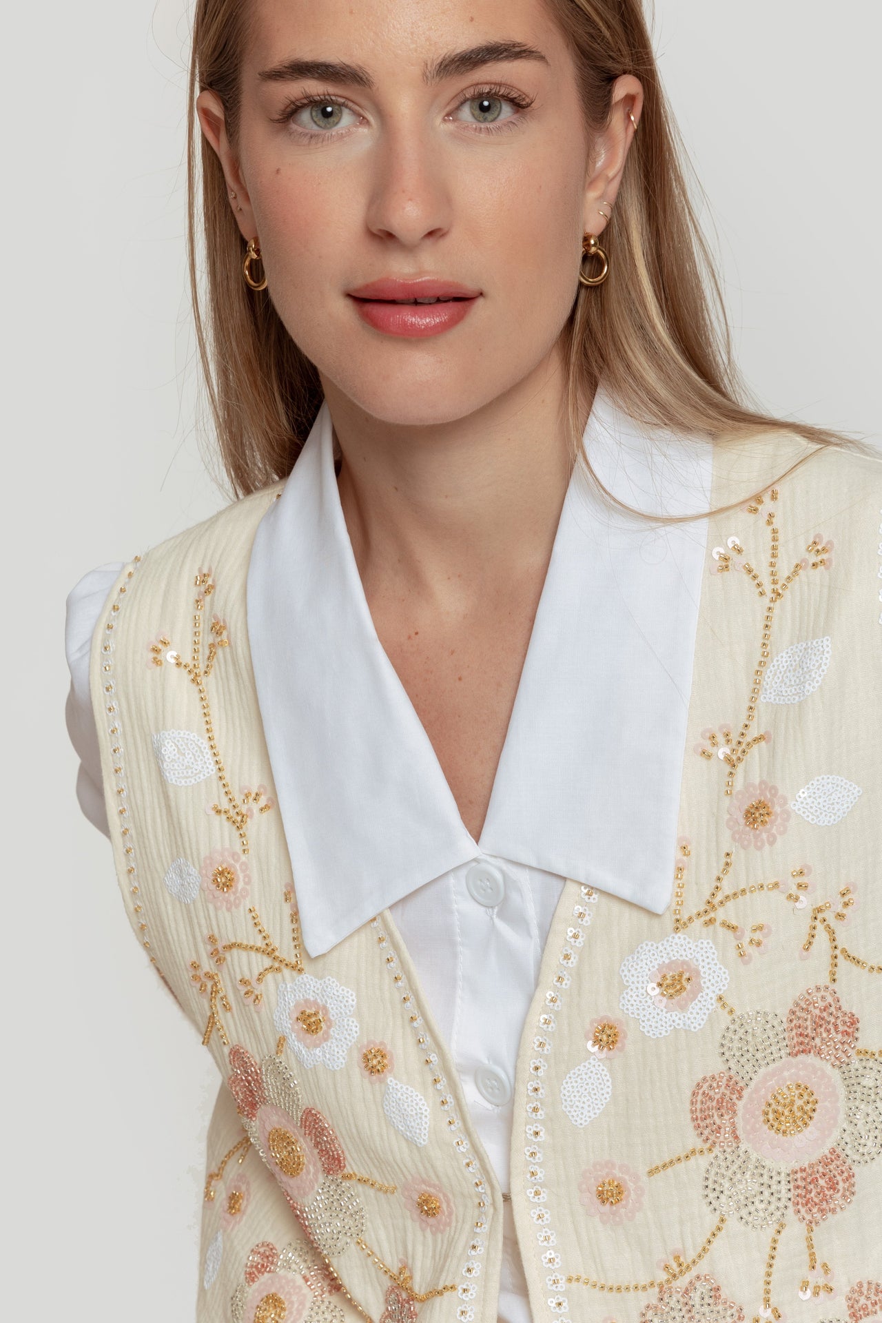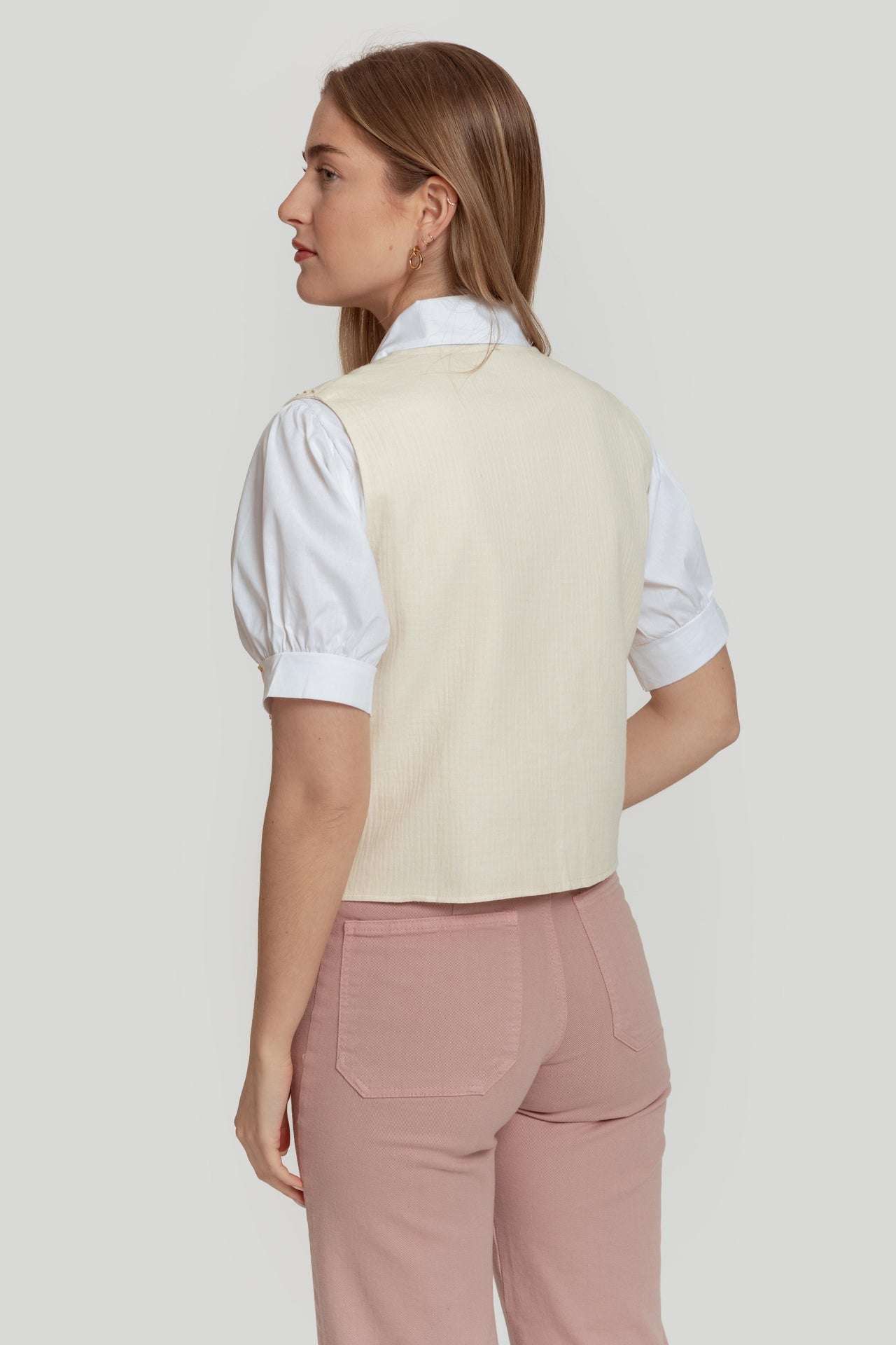- Estilo: chaleco corto sin cierre, pensado para superponerse sobre una prenda superior.