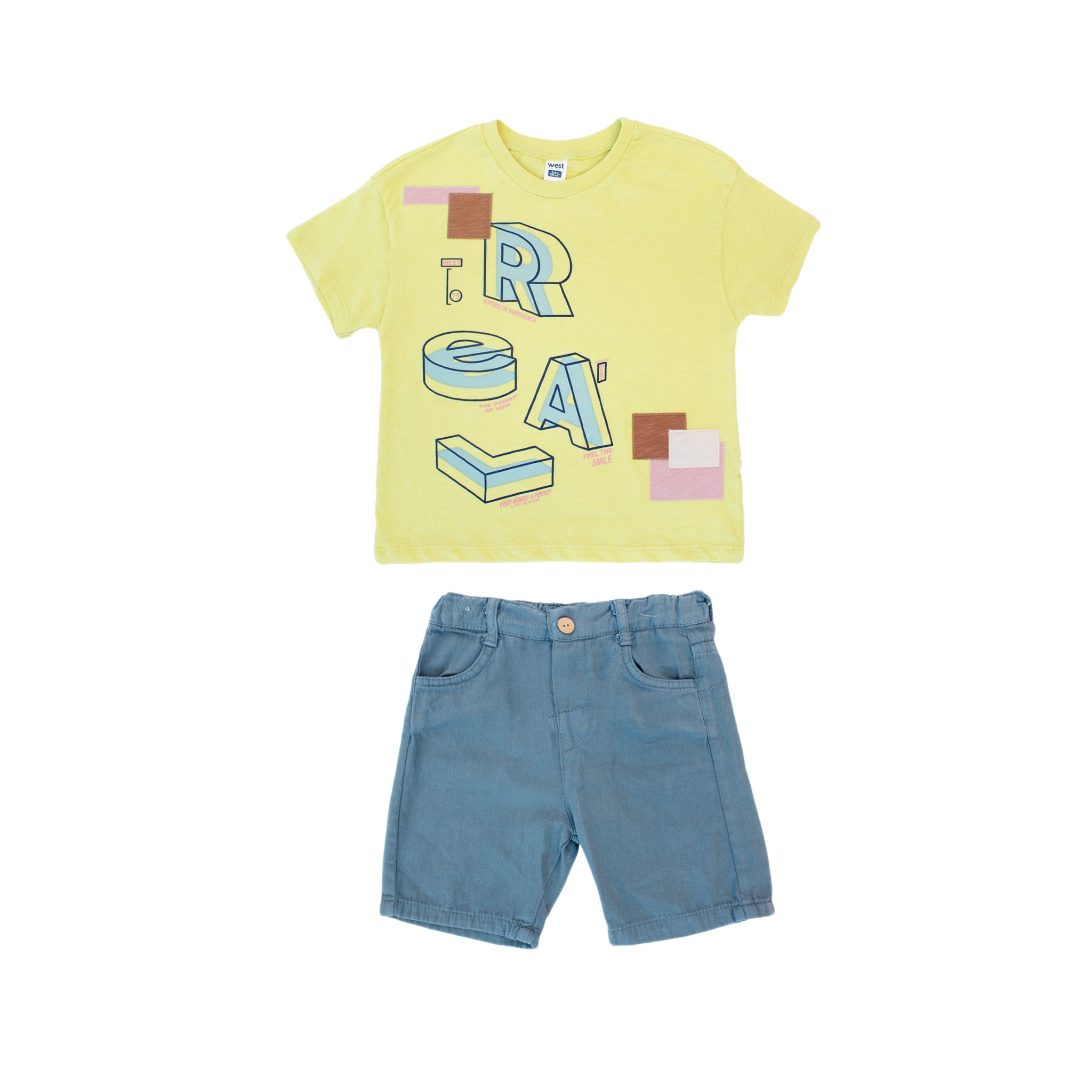 - Camiseta de manga corta en color amarillo con un estampado gráfico colorido que aporta un toque lúdico al conjunto.
