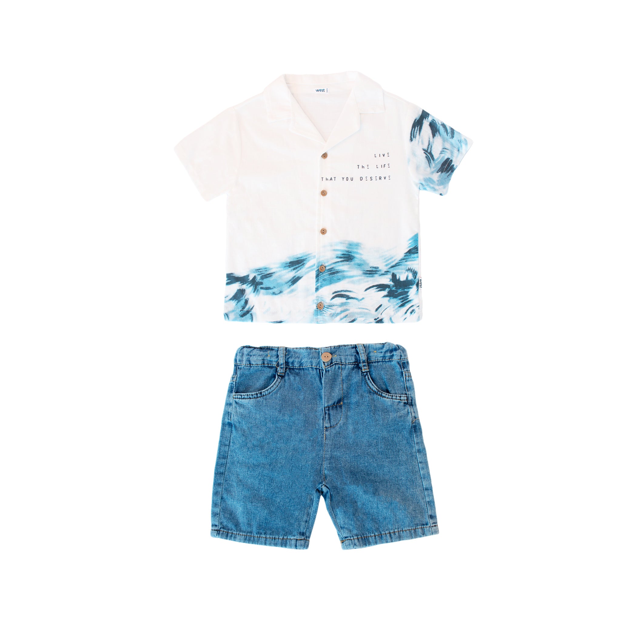- Camisa de manga corta en blanco con estampado azul en la parte inferior y en la manga, con cierre frontal mediante botones de color marrón claro.