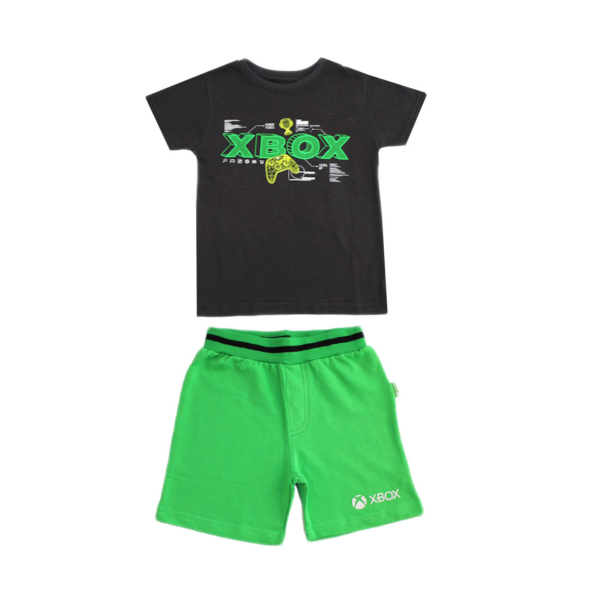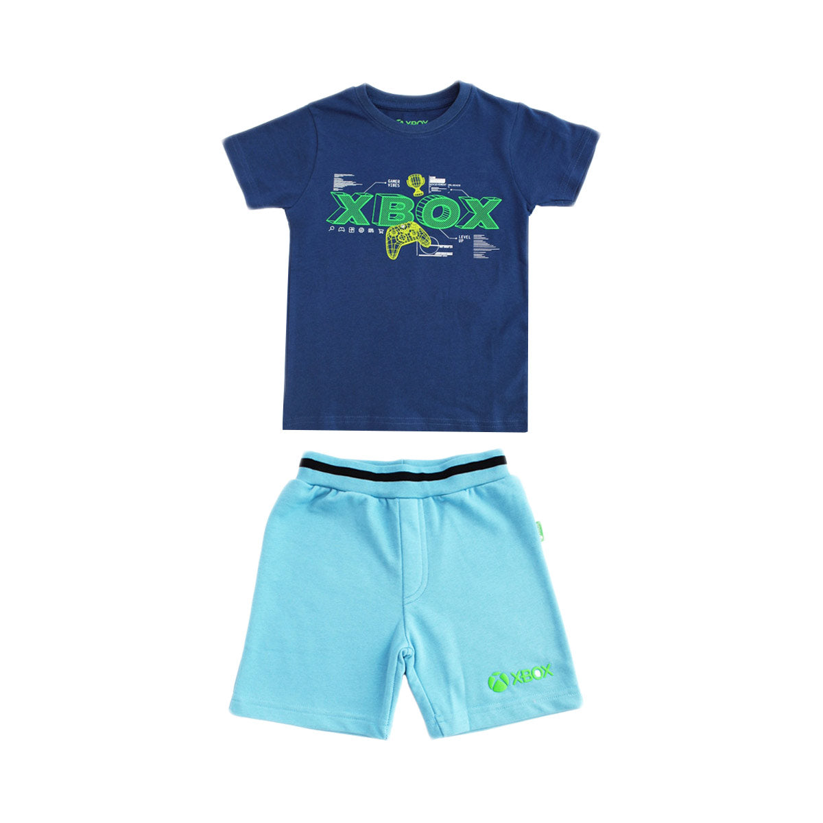 Conjunto Xbox de manga corta para niños, dos piezas diseñadas para fans de los videojuegos que buscan comodidad y estilo en su ropa diaria. Este set combina una camiseta azul marino con estampado Xbox y unos shorts azul claro, creando un look coordinado perfecto para jugar, salir o estar en casa.