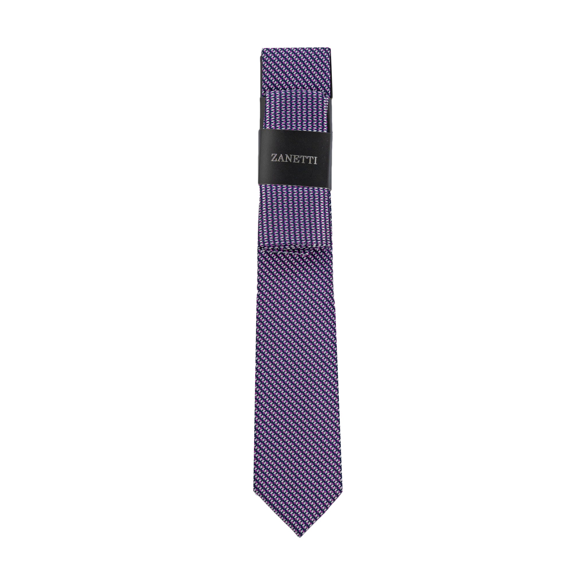 La Corbata Zanetti con Pañuelo para Caballeros es un conjunto elegante pensado para hombres que buscan coordinación y presencia en cada detalle. Su tono morado profundo y el patrón diagonal aportan un toque distintivo, perfecto para trajes formales y reuniones de negocio.