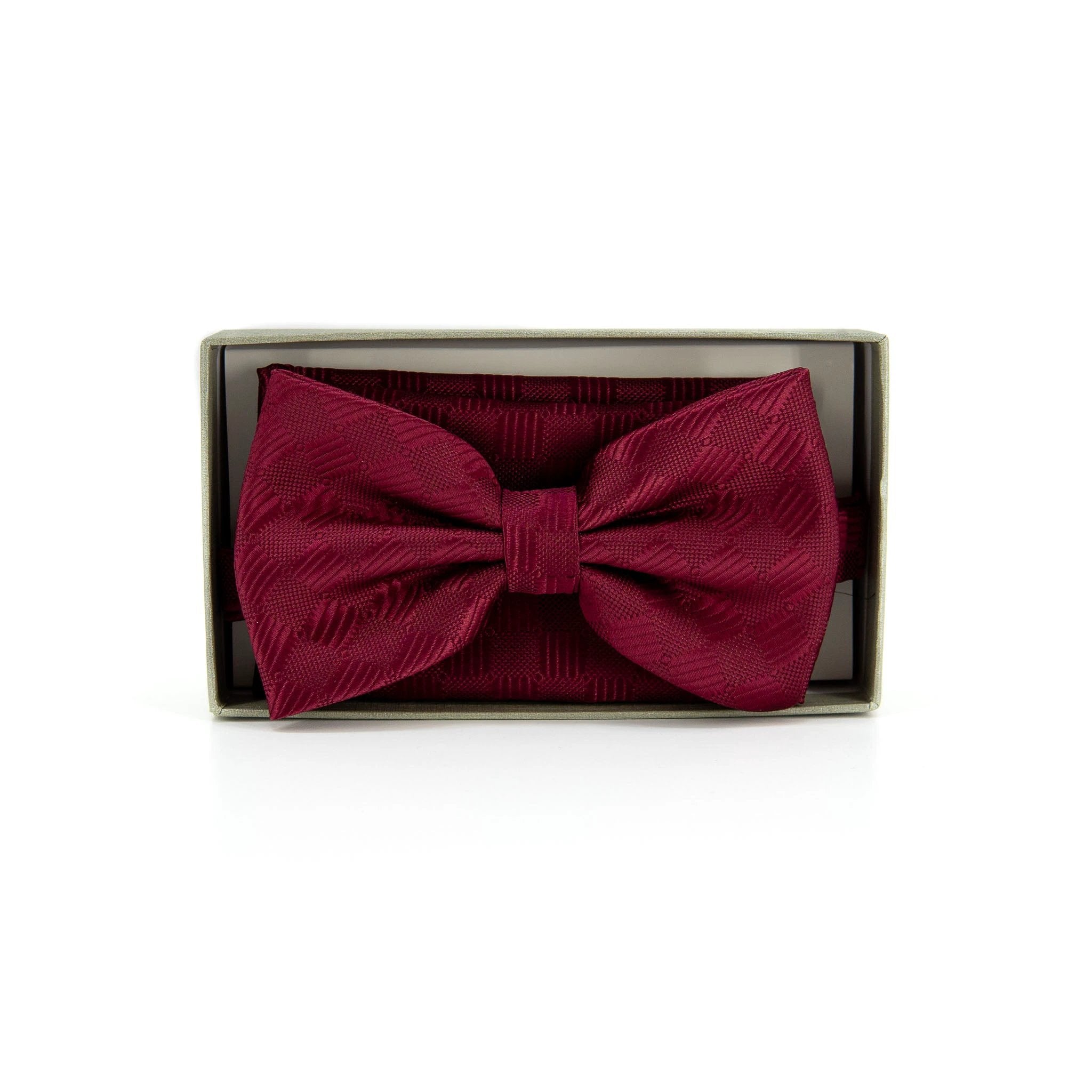Conjunto de corbatín y pañuelo para caballeros de Charles S Wain, diseñado para quienes buscan un toque de distinción en eventos formales. Este conjunto, identificado como PMTH5062 BROCAD, ofrece un acabado elegante en tejido brocado de granate profundo que eleva cualquier traje oscuro.