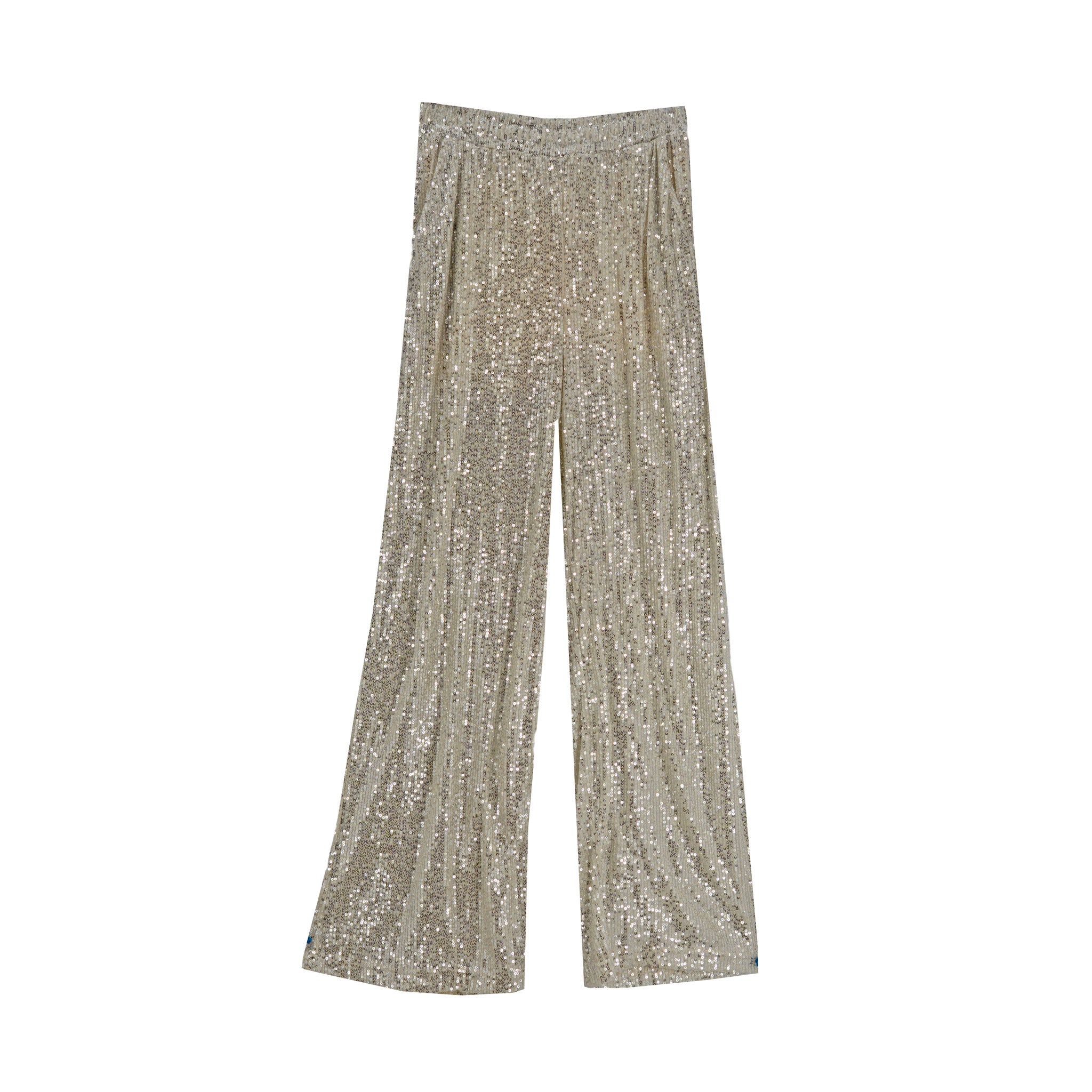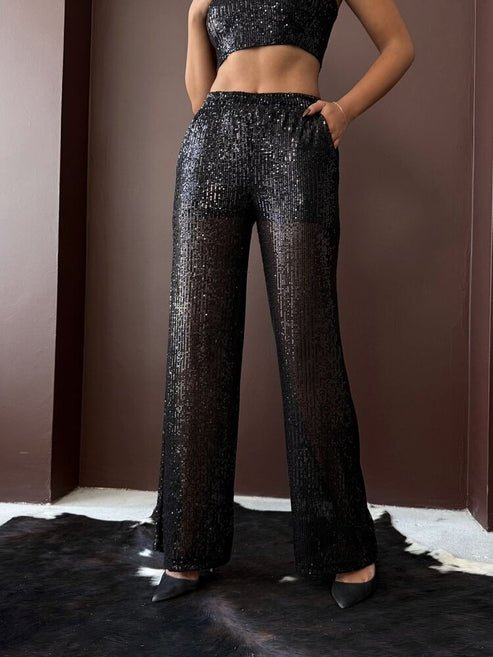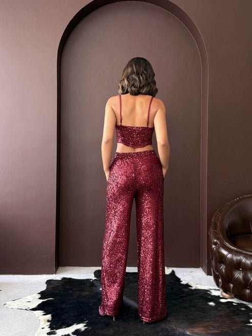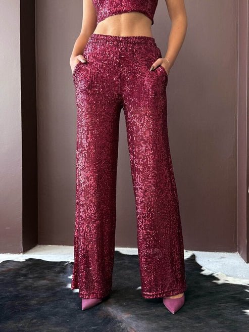 Con un acabado de lentejuelas brillantes en tono burdeos y una silueta de pierna amplia, son la opción ideal para eventos, fiestas y celebraciones de alto impacto.