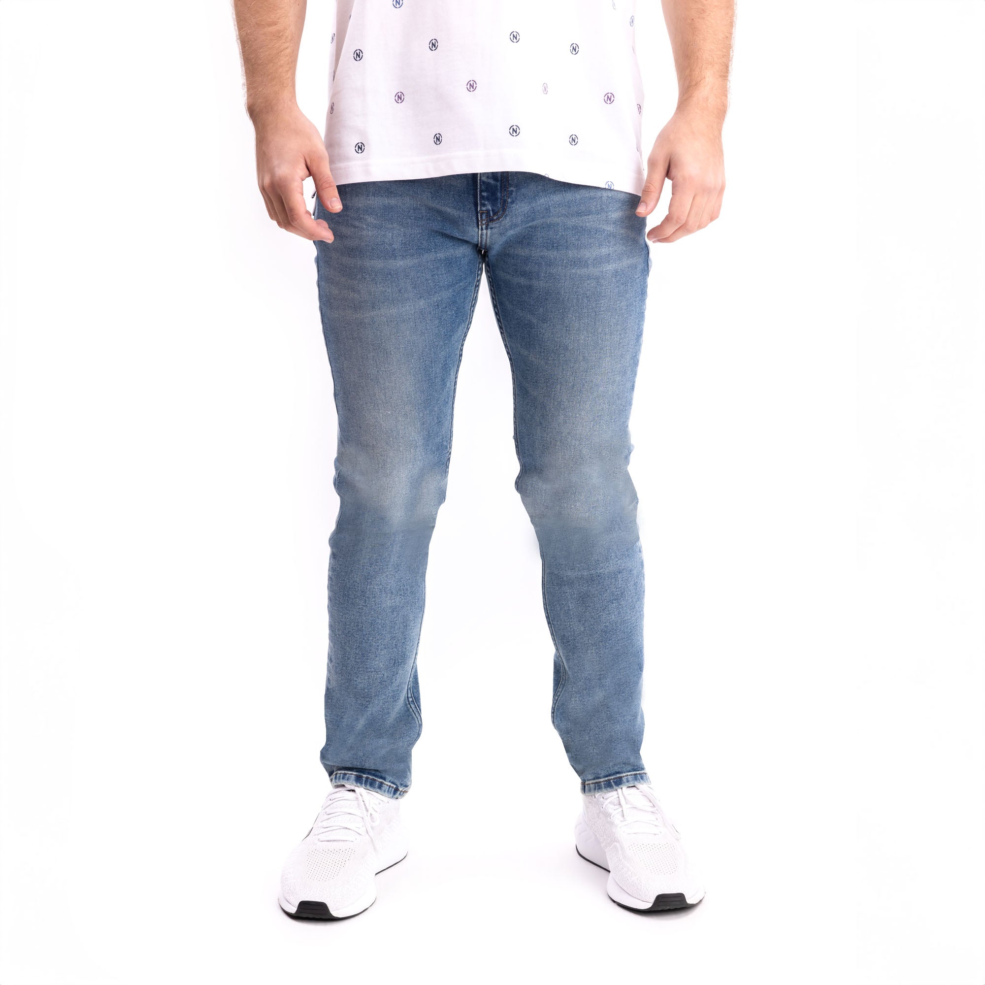 - Lavado azul medio con desgaste sutil: un tono atemporal que se adapta a looks casuales y semiformales.