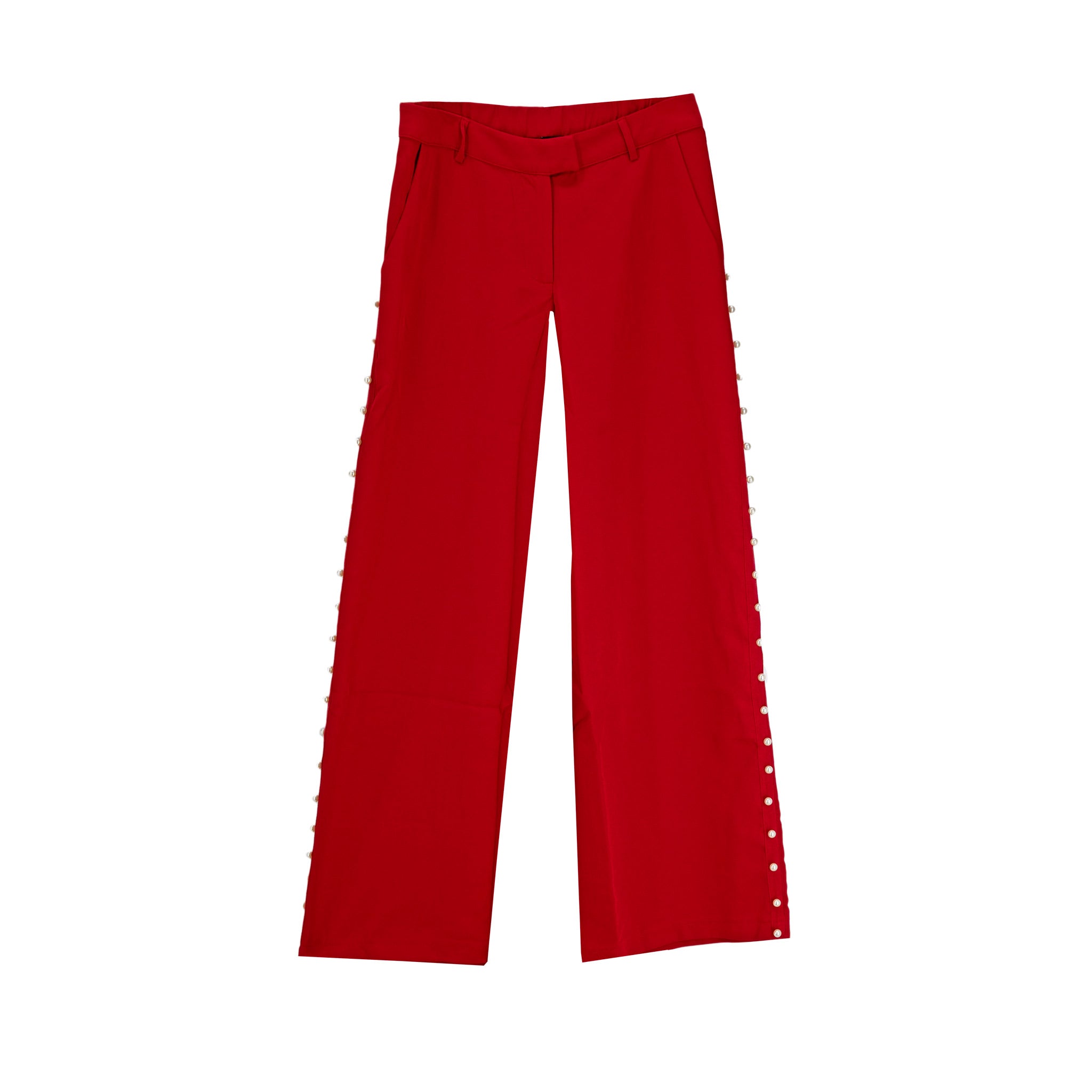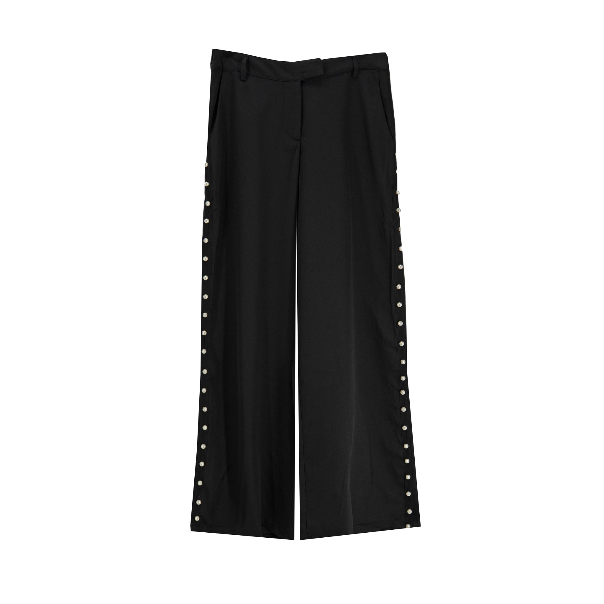 Con un look modernamente femenino, estos pantalones elevan cualquier conjunto, ya sea combinado con una blusa neutra o una prenda más elaborada. Las perlas laterales aportan un detalle distintivo sin sobrecargar el outfit, mientras que la silueta amplia favorece una movilidad plena. Perfectos para lograr un estilo chic y versátil que acompaña tanto en el día a día como en eventos sociales.