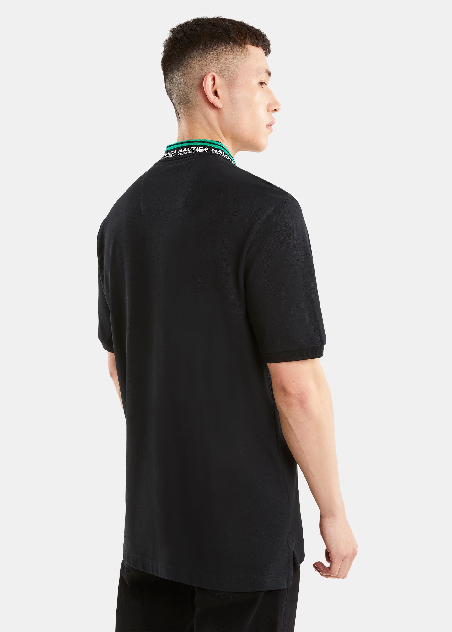 - Cuello polo con ribete y detalle de branding en el borde.