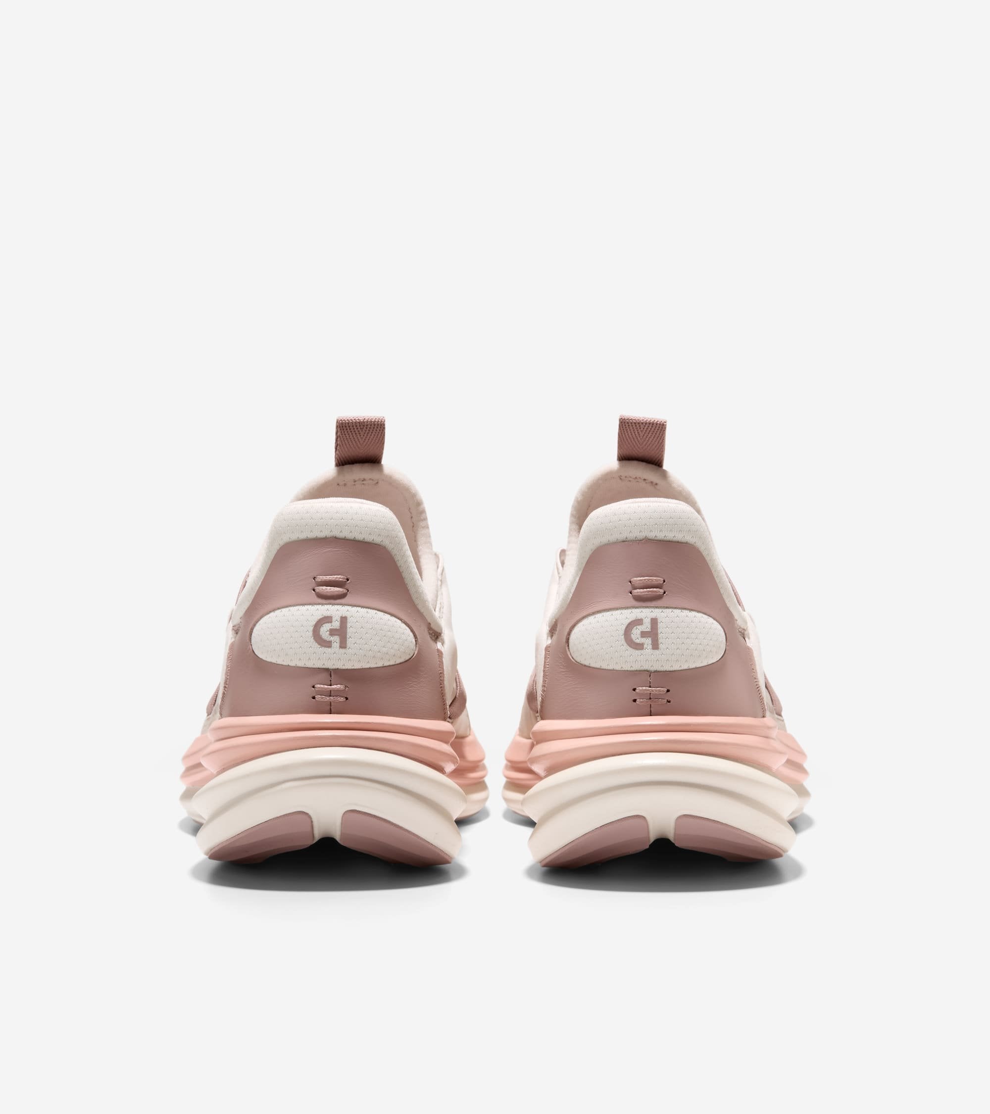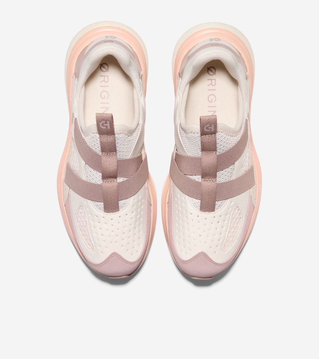- Parte superior de poliéster transpirable con tonos rosados y crema, diseñada para envolver el pie con ligereza.