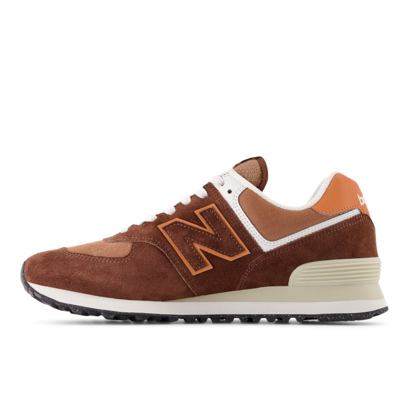 En la parte superior se observa una combinación de gamuza y malla en tonos marrón, con detalles en beige y un distintivo logotipo N en naranja que aporta un toque atemporal y urbano.