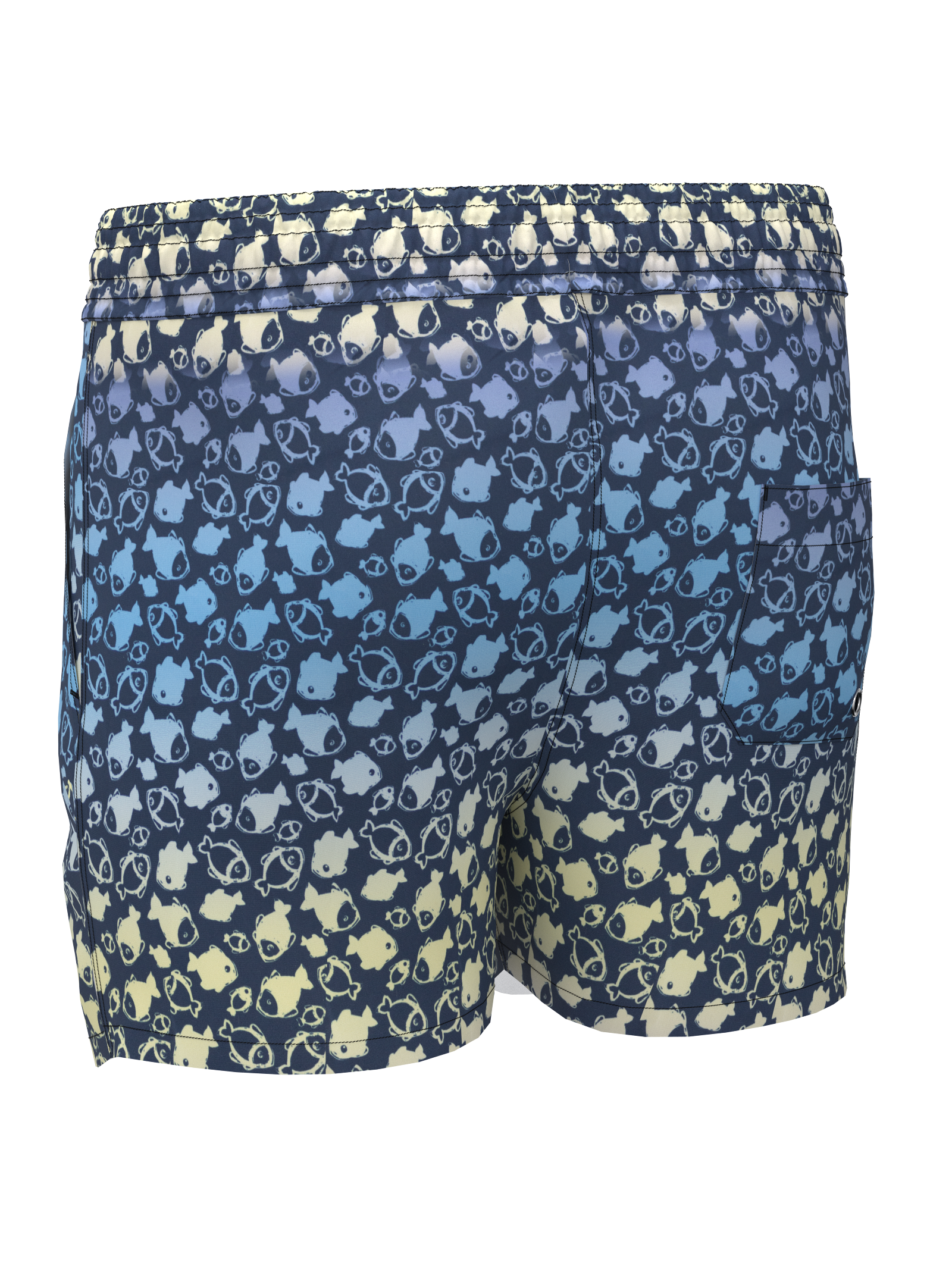 - Patrón degradé en tonos azul intenso que va hacia un suave beige, acompañado de un motivo repetido discreto en la tela.