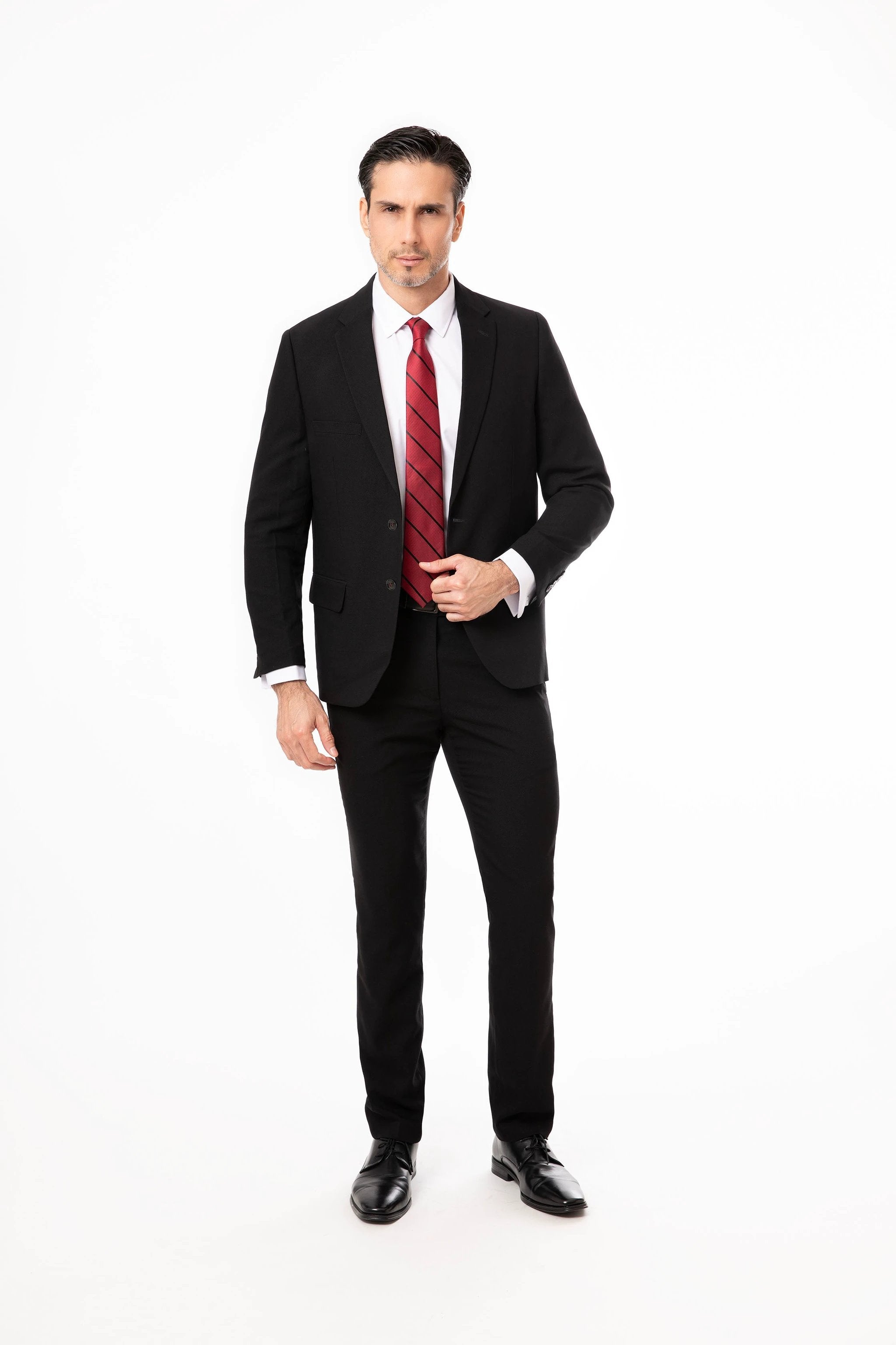 - Chaqueta de dos botones en negro clásico, con líneas limpias que definen la silueta.