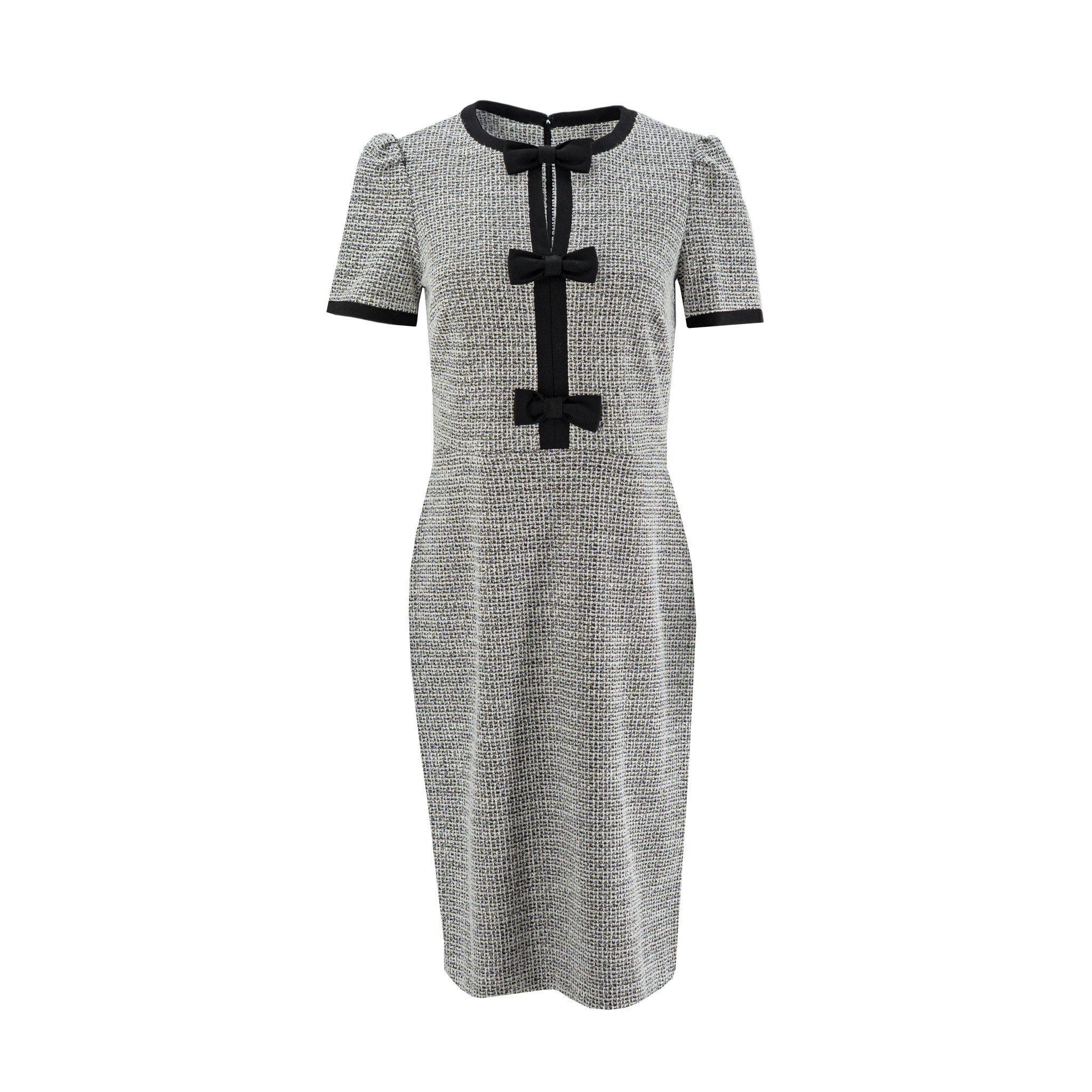 - Cuello redondo con ribete negro y una tira central adornada con tres lazos negros