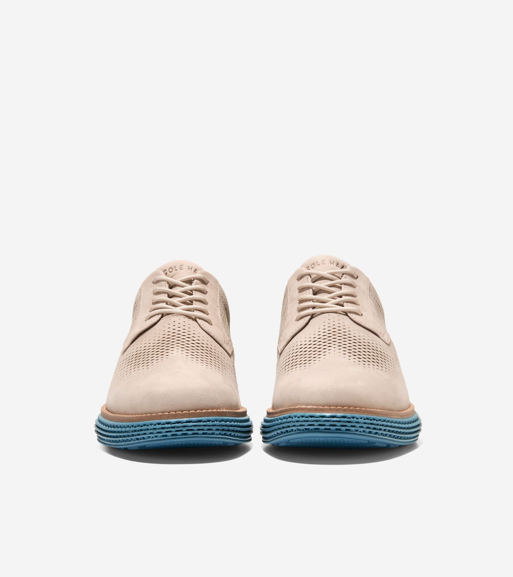 Los Zapatos Cole Haan Original Grand 2.0 para caballeros combinan estilo contemporáneo con comodidad de alto rendimiento, pensados para hombres que buscan un calzado versátil para vestir y combinar con looks casuales. Con un empeine beige perforado y una suela azul distintiva, ofrecen un look moderno sin sacrificar rendimiento durante el día.